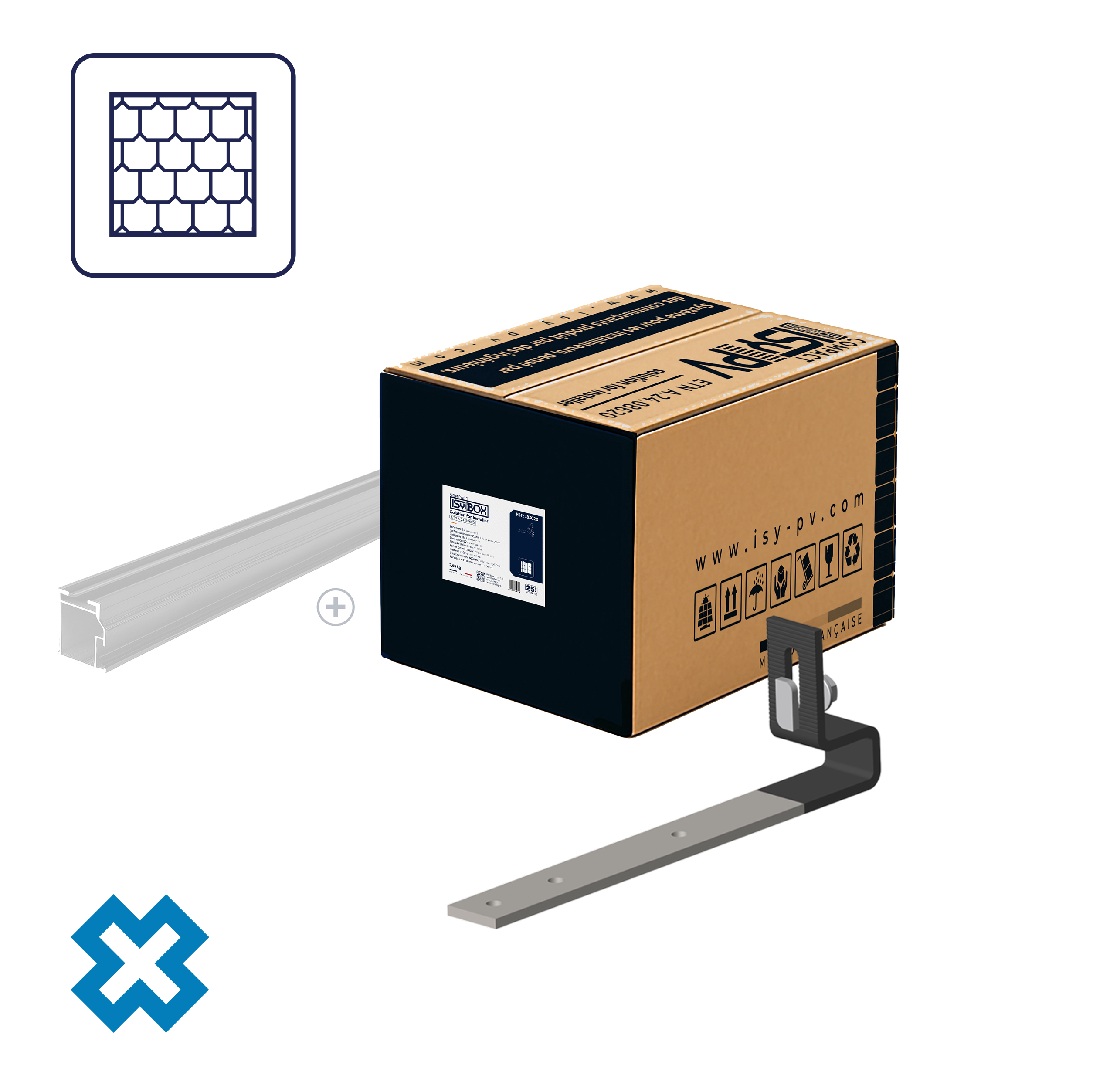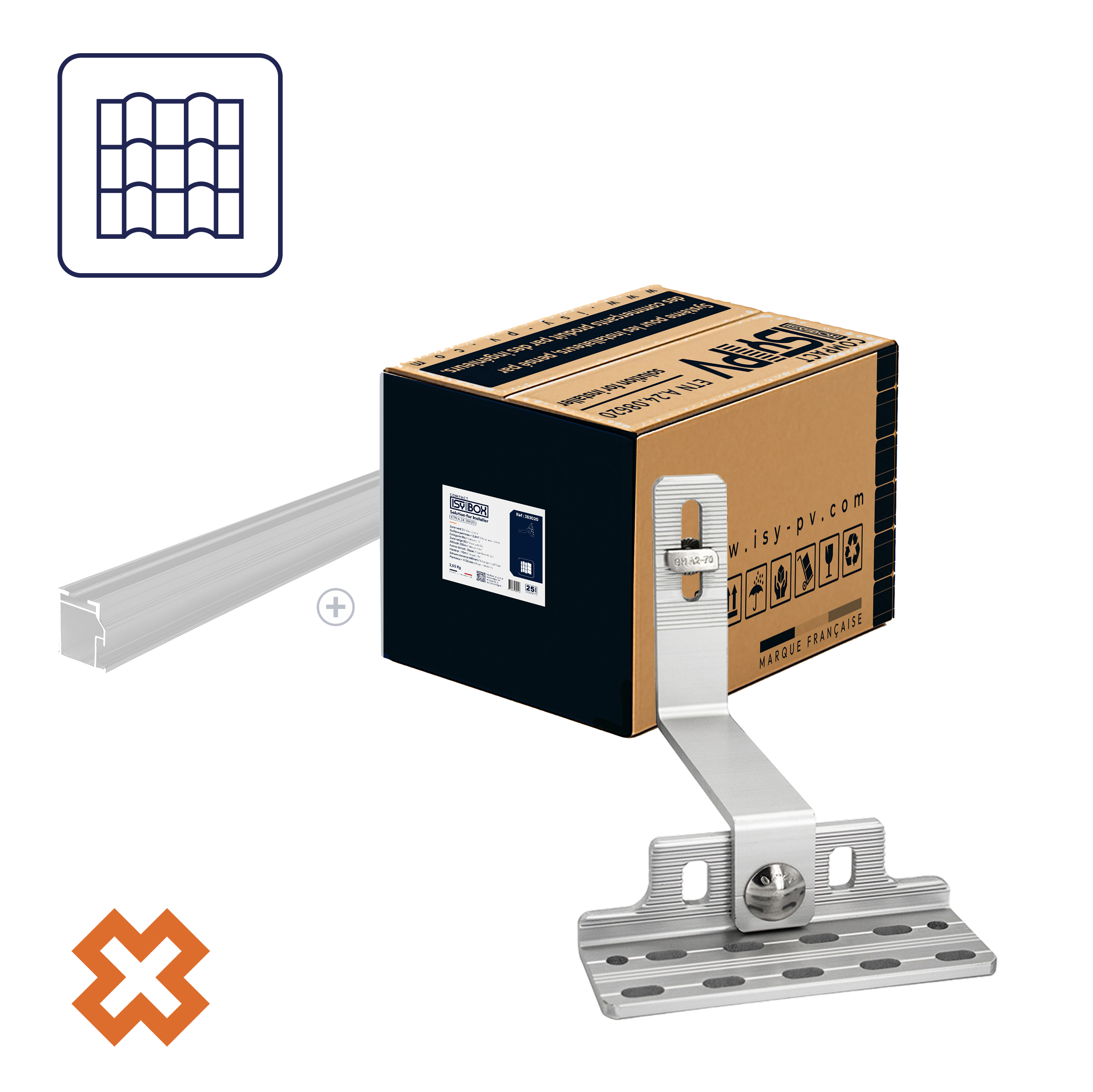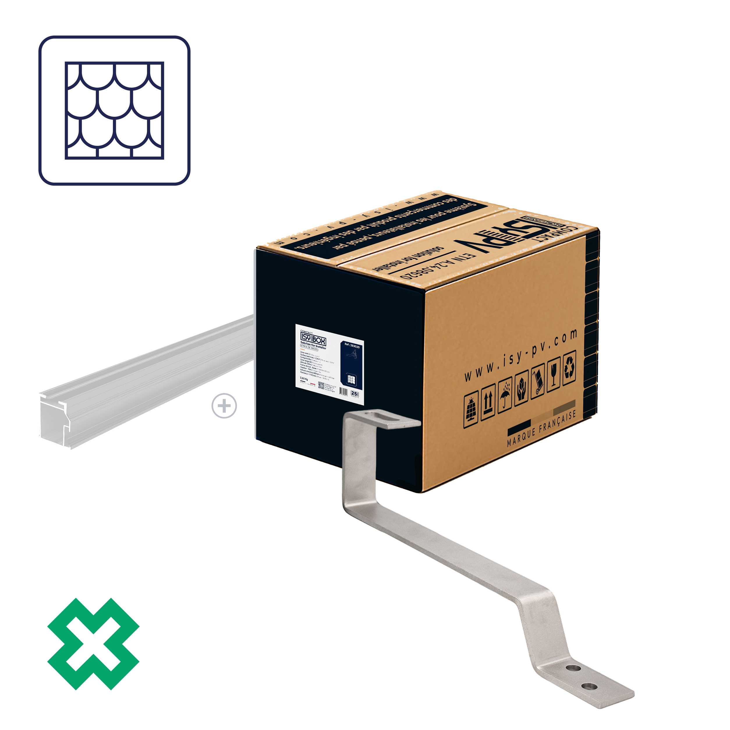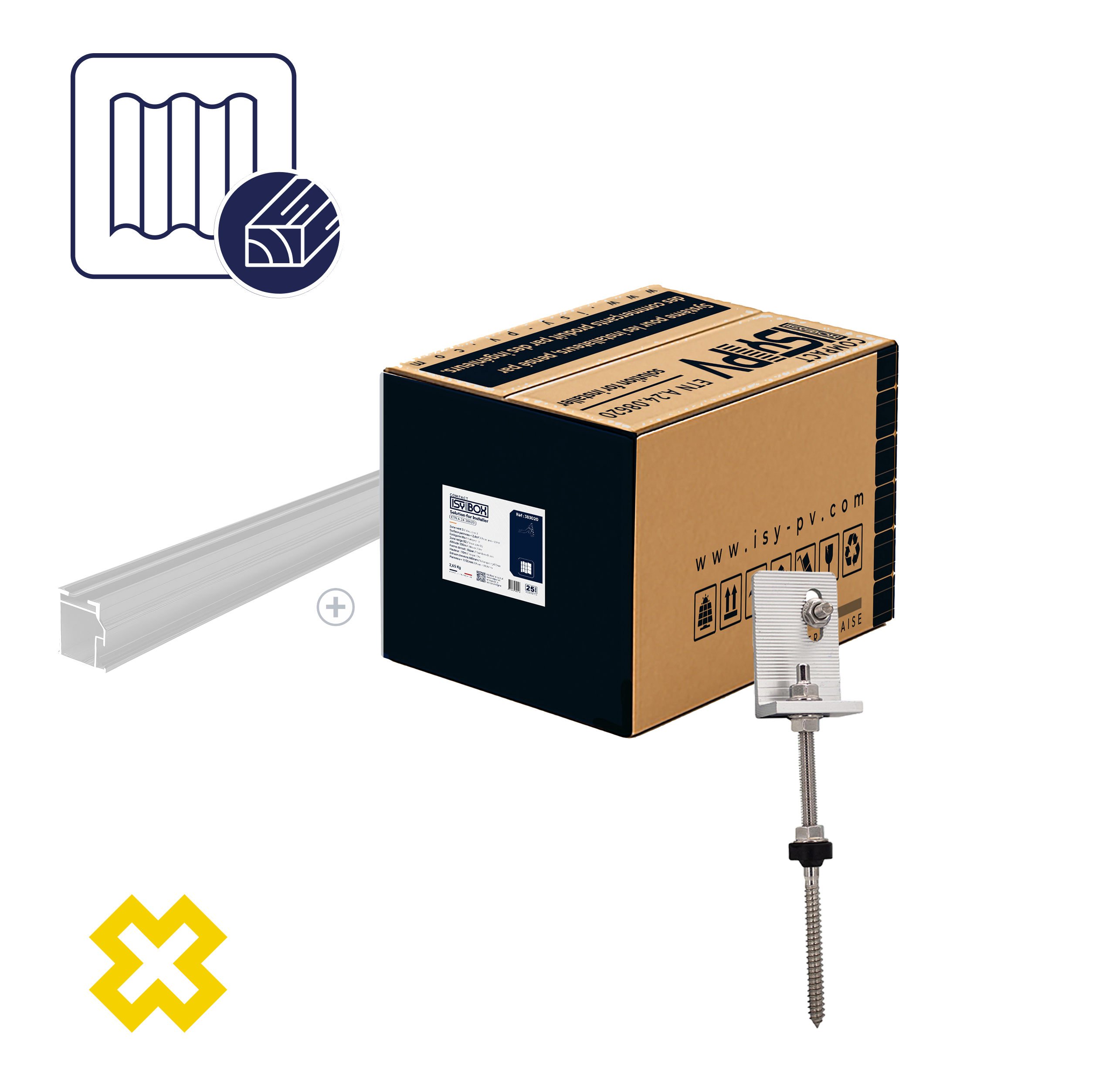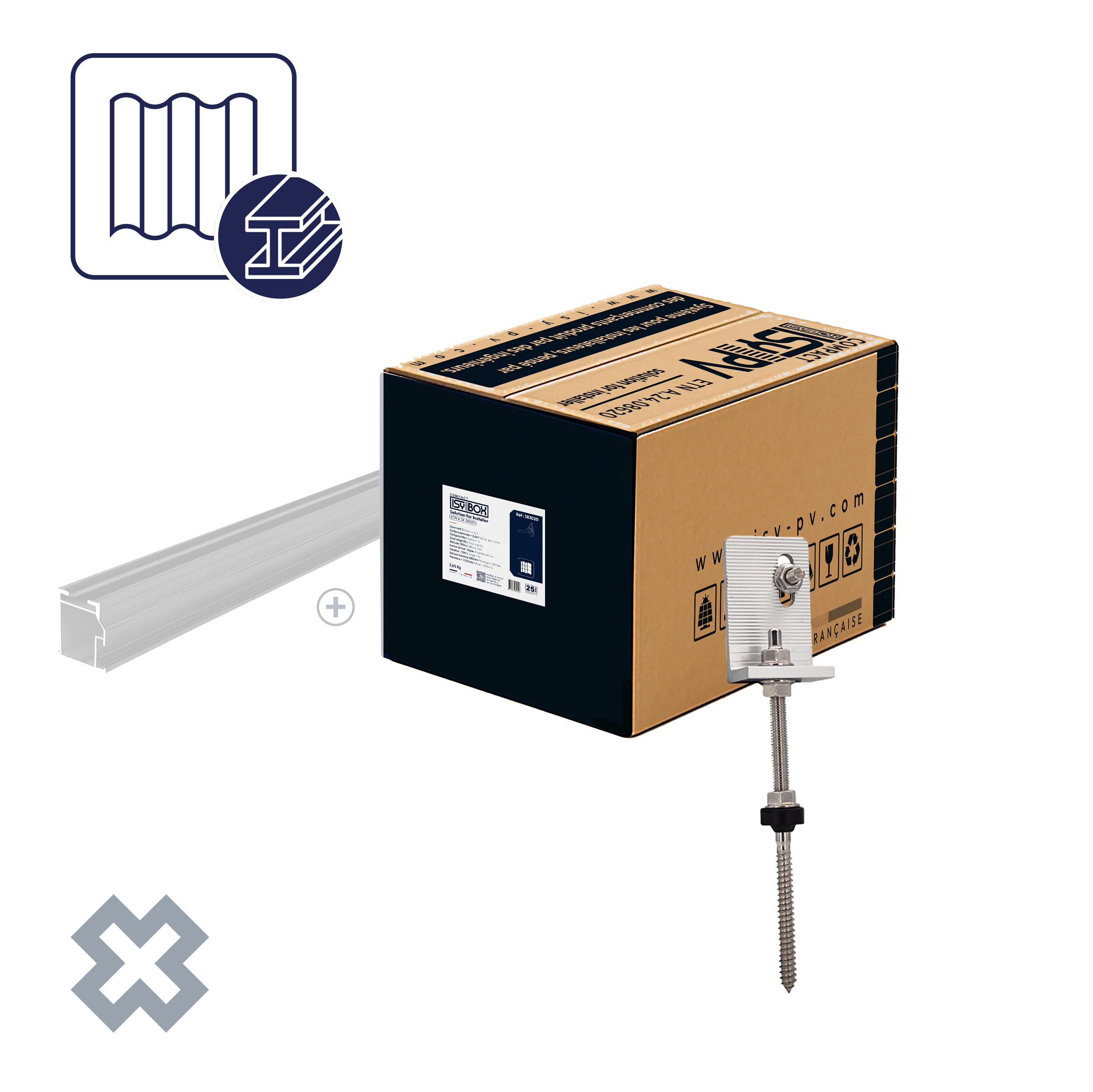 Chaque ISY-BOX COMPACT est conçue avec tous les accessoires essentiels pour installer vos panneaux en surimposition de toiture, où chaque couleur correspond à un type de couverture et inclut le crochet ou le tirefond approprié.